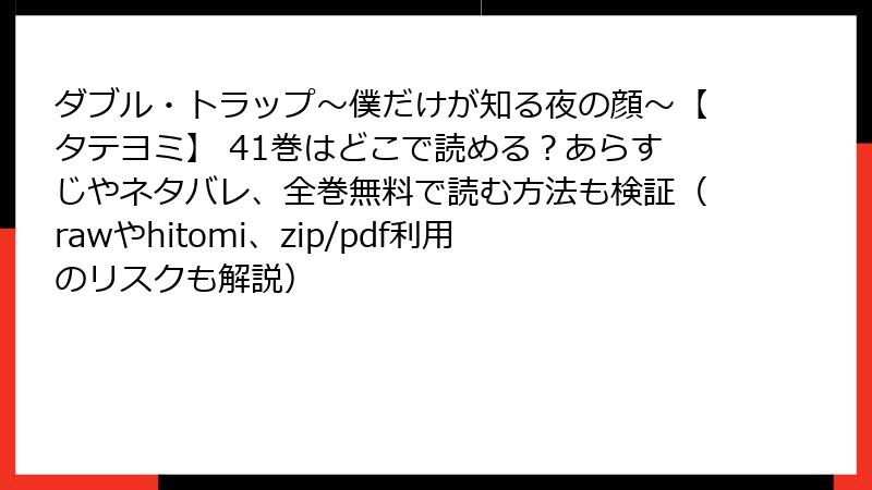 「ダブル・トラップ〜僕だけが知る夜の顔〜」のような人気BL漫画を無料で楽しみたいと思う気持ちはわかりますが、海賊版サイト(raw、hitomi.la、zip共有、pdfダウンロード、漫画バンクなど)を利用するのは多大なリスクを伴います。これらのサイトは著作権を無視した違法アップロードが主で、ユーザーは知らず知らずのうちにトラブルに巻き込まれる可能性が高いです。ここでは、法的・セキュリティ・品質・倫理的な側面から詳しく解説します。合法的なプラットフォームで読むことを強くおすすめします。