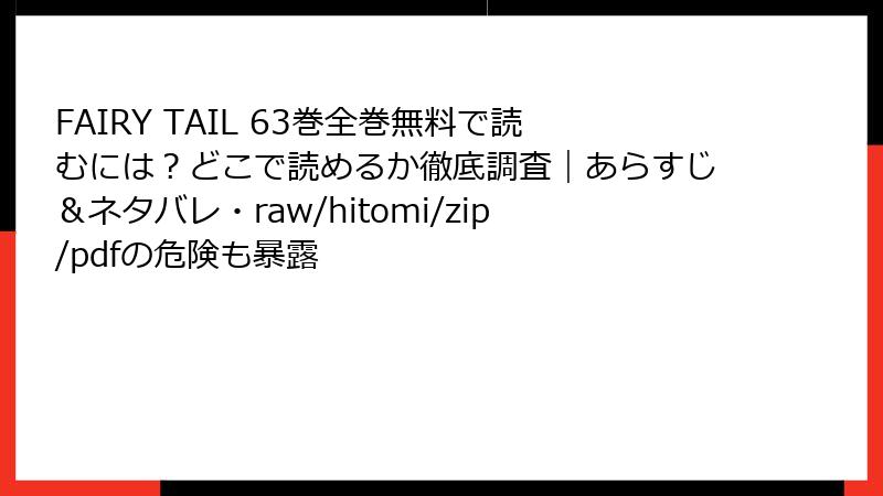 人気マンガ『FAIRY TAIL』の63巻を、raw、hitomi、zip、pdf、漫画バンクなどの海賊版サイトで読むことは、一見手軽に思えるかもしれません。しかし、これらのサイトを利用する行為には深刻なリスクが伴います。この記事では、法的側面からセキュリティ、プライバシー、コンテンツ品質、倫理的影響までを詳しく解説します。海賊版サイトは著作権を侵害する違法なものであり、利用を避けることが賢明です。以下で各リスクを深掘りします。