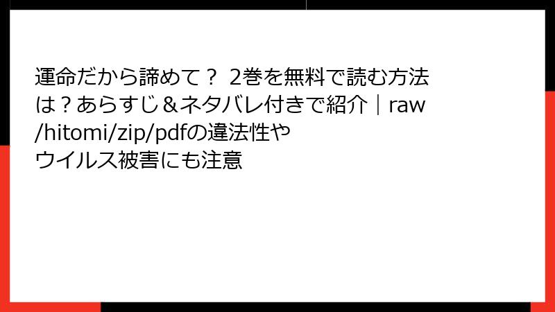 海賊版サイトを利用することは、漫画業界全体に悪影響を及ぼします。作者の収入が減少し、新作の制作意欲が低下するだけでなく、出版社の倒産リスクも高まります。「運命だから諦めて?」のような人気作品が海賊版で拡散されると、公式販売が打撃を受け、結果として質の高いコンテンツが生まれにくくなります。倫理的に見て、クリエイターの努力を踏みにじる行為であり、長期的にファン自身が損をする構造です。