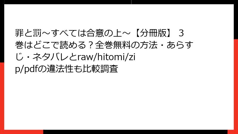 「罪と罰~すべては合意の上~【分冊版】3巻」のような人気漫画を、raw、hitomi、zip、pdf、漫画バンクなどの海賊版サイトで無料で読もうとする人は少なくありません。これらのサイトは、著作権を無視してスキャンされた漫画データをアップロードし、誰でもダウンロードや閲覧可能にしています。しかし、こうした行為は一見便利に見えても、深刻なリスクを伴います。以下では、法的、セキュリティ、プライバシー、品質、経済・倫理的な観点から詳しく解説します。