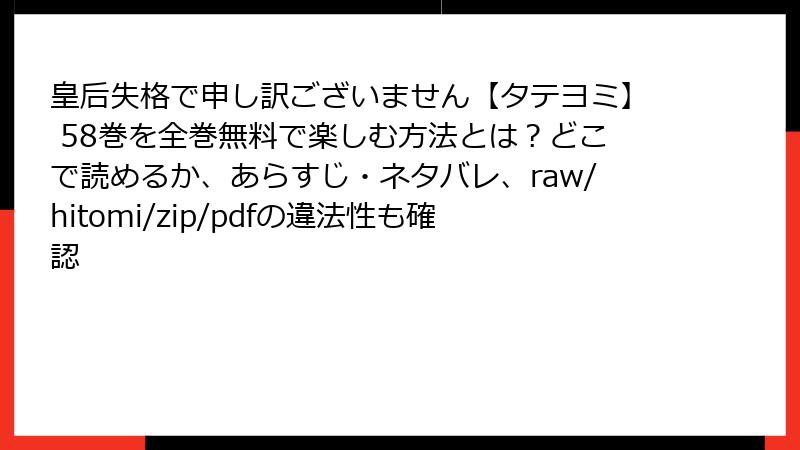「皇后失格で申し訳ございません【タテヨミ】」のような人気漫画を、raw/hitomi/zip/pdf/漫画バンクなどの海賊版サイトで無料で読もうとする人は少なくありません。しかし、これらのサイトは著作権を無視した違法アップロードが横行しており、利用者はさまざまなリスクにさらされます。海賊版サイトは一見便利に見えますが、法的・セキュリティ的な危険が伴い、クリエイターや業界全体に悪影響を及ぼします。以下で詳しく解説します。
