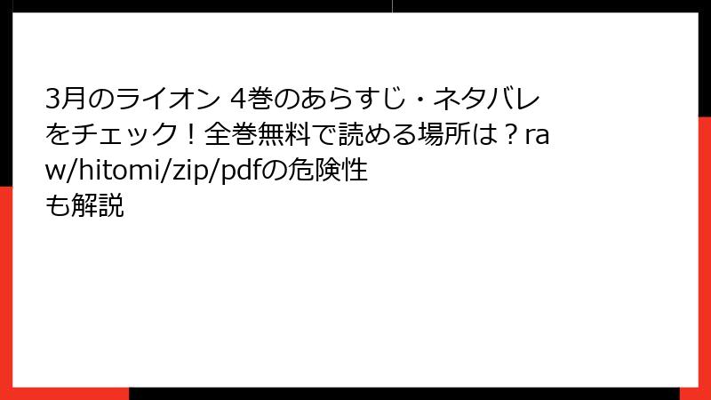 人気漫画『3月のライオン』4巻を、raw、hitomi、zip、pdf、漫画バンクなどの海賊版サイトで読むことは、便利そうに見えて実は多大なリスクを伴います。これらのサイトは著作権を侵害した違法コンテンツを配信しており、利用者はさまざまな危険にさらされます。本記事では、法的側面からセキュリティ、プライバシー、経済的影響まで、詳しくリスクを解説します。海賊版の利用は避け、正しい方法で楽しむことを強くおすすめしますが、ここではリスクに焦点を当てて深掘りします。