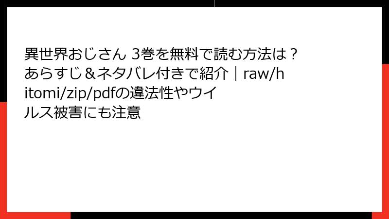『異世界おじさん 3巻』を海賊版サイトで読むことは、法的罰則、セキュリティ脅威、倫理的ジレンマ、品質低下という多角的なリスクを伴います。これらの問題は、無料という魅力以上に大きい代償を払うことになるでしょう。クリエイターを支援し、自分を守るためにも、正規の購入や配信サービスを利用することをおすすめします。マンガ文化を長く楽しむために、賢い選択を心がけましょう。