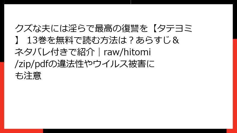 raw、hitomi、zip、pdf、漫画バンクなどの海賊版サイトは、無料で漫画やコミックを提供する違法なプラットフォームです。これらのサイトでは、正規の購入ルートを迂回して、著作権を無視したアップロードされたコンテンツが横行しています。一見、無料で簡単にアクセスできる魅力がありますが、これは大きな罠です。こうしたサイトを利用することで、ユーザーはさまざまなリスクにさらされます。特に、クズな夫には淫らで最高の復讐を【タテヨミ】のような人気作品を狙った海賊版は、ダウンロード数が増えやすく、問題が深刻化しやすいのです。