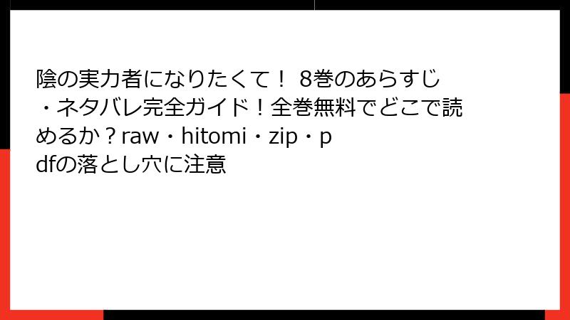 第8巻のレビュー・口コミを総括すると、肯定的意見が9割以上を占め、「笑いあり涙ありのエンタメの極み」との評価が主流。批判は主人公の個性ゆえのものですが、それがシリーズの独自性でもあります。アニメファンからコミック入門者まで幅広い支持を集め、2025年現在も「再読推奨」の声が。もし未読なら、ぜひ正規ルートで手に取ってみて! この巻が、あなたの「陰の実力者」人生を変えるかも?