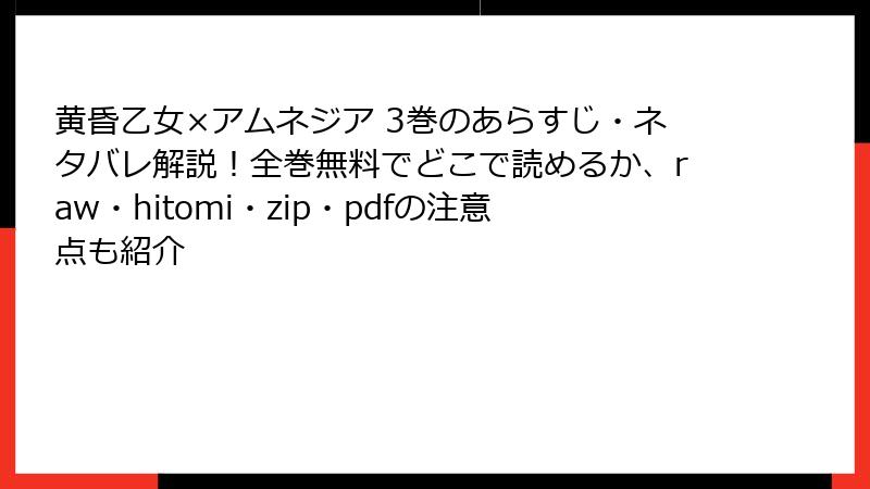 こんにちは、漫画ファン向けのブログへようこそ! 今日は人気作『黄昏乙女×アムネジア』を、raw、hitomi、zip、pdf、漫画バンクといった海賊版サイトで無料で読もうとする行為のリスクについて、詳しく掘り下げます。無料で手軽に楽しめそうに思えますが、実は法的な罰則からセキュリティの脅威まで、さまざまな危険が潜んでいます。海賊版利用はクリエイターを傷つけるだけでなく、自分自身にも大きな損害を及ぼす可能性大。以下では、具体的なリスクをカテゴリ別に解説し、なぜ避けるべきかを読み応えたっぷりでお届けします。合法的な手段で楽しむことをおすすめしますよ!