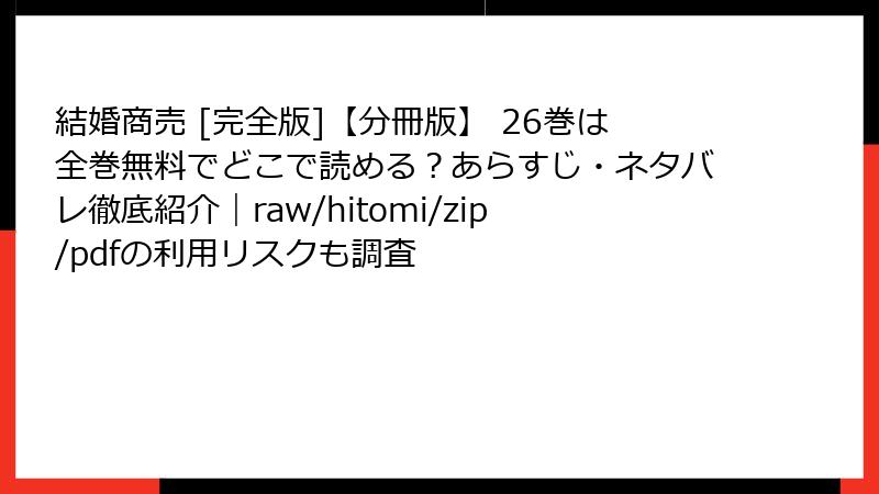 『結婚商売』のような人気漫画を無料で読める海賊版サイト(raw、hitomi、zip、pdf、漫画バンクなど)は、一見便利に思えます。しかし、これらのサイトを利用することは、法的・セキュリティ面での深刻なリスクを伴います。この記事では、そうしたリスクを詳しく解説し、なぜ正規ルートで楽しむべきかを考えます。海賊版はクリエイターの努力を無視した行為であり、長期的に見て業界全体を衰退させる可能性もあります。