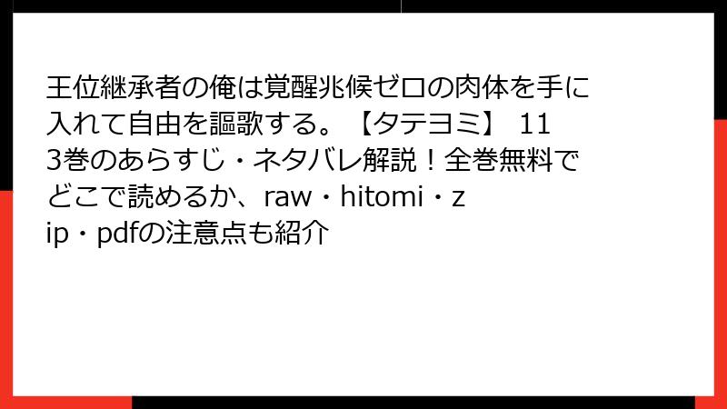 人気の異世界転生ファンタジー漫画『王位継承者の俺は覚醒兆候ゼロの肉体を手に入れて自由を謳歌する。【タテヨミ】』が、ついに113巻を迎えました。このシリーズは、覚醒システムが世界を支配する中で、才能ゼロの体を得て自由を求める主人公のユニークな冒険を描いた作品です。今回は、113巻のあらすじをネタバレ満載で詳しく掘り下げます。まだ読んでいない方はご注意を! 読み応えを重視して、ストーリーの流れを章立て風にまとめ、キャラクターの心理やアクションシーンも重点的に解説します。