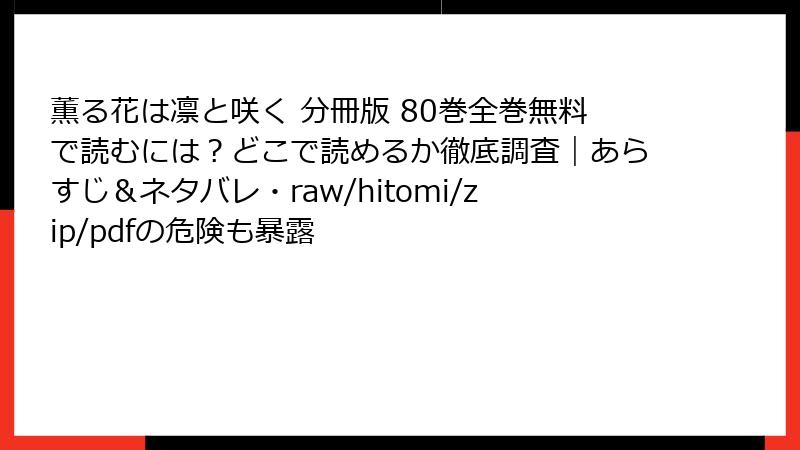 こんにちは、漫画ファンとして正規ルートを推奨するブロガーです。今日は、人気BL作品『薫る花は凛と咲く 分冊版 80巻』を、raw、hitomi、zip、pdf、漫画バンクなどの海賊版サイトで読むことのリスクについて、詳しく掘り下げます。この作品は三香見サカ先生の繊細な物語が魅力ですが、海賊版を利用するのは一見お得に見えて、実は大きな落とし穴がいっぱい。法的問題からセキュリティの脅威まで、複数の角度から解説します。海賊版はクリエイターの権利を侵害するだけでなく、自分自身を危険にさらす行為です。読み応えのある記事にまとめましたので、ぜひ最後までお読みください。最終的に、正規購入の大切さを再認識していただければ幸いです。