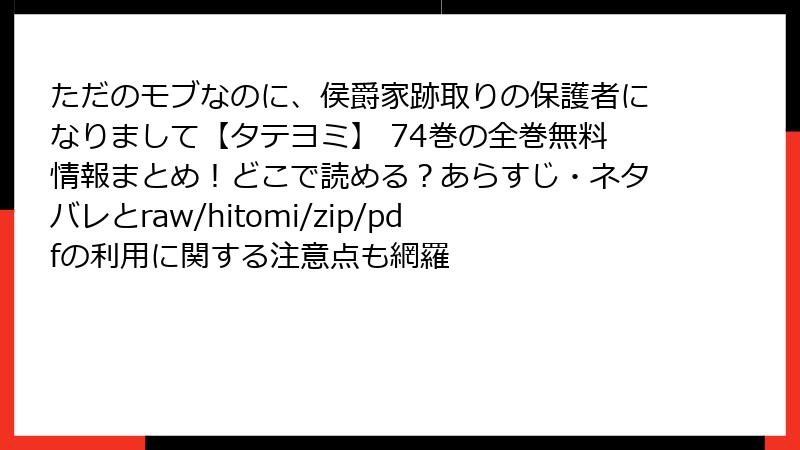 人気のタテヨミコミック「ただのモブなのに、侯爵家跡取りの保護者になりまして【タテヨミ】」は、異世界転生の魅力的なストーリーで多くのファンを魅了しています。しかし、raw、hitomi、zip、pdf、漫画バンクなどの海賊版サイトで無料で読もうとする行為には、深刻なリスクが伴います。これらのサイトは著作権を侵害した違法アップロードが多く、利用者は知らず知らずのうちにトラブルに巻き込まれる可能性があります。以下で、法的、セキュリティ、プライバシー、経済的、品質・倫理的観点から詳しく解説します。
