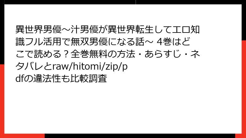 人気の異世界転生コミック「異世界男優~汁男優が異世界転生してエロ知識フル活用で無双男優になる話~」を、raw、hitomi、zip、pdf、漫画バンクなどの海賊版サイトで読むことは、手軽に見える一方でさまざまなリスクを伴います。この記事では、そうした海賊版サイトを利用する際の潜在的な危険性を詳しく解説します。法的問題からセキュリティの脅威まで、幅広く掘り下げてみましょう。海賊版はクリエイターの権利を侵害する行為であり、公式ルートでの利用をおすすめしますが、ここではリスクに焦点を当てます。