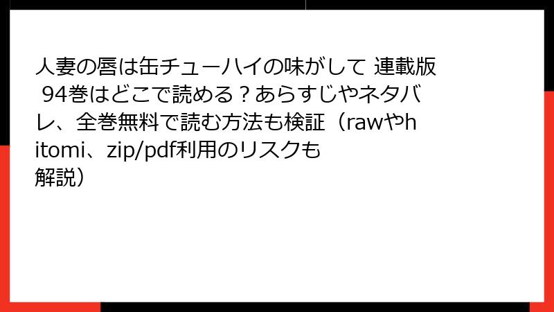 人気漫画『人妻の唇は缶チューハイの味がして』を、raw、hitomi、zip、pdf、漫画バンクなどの海賊版サイトで読むのは、手軽に思えるかもしれません。しかし、これらのサイトを利用することは、さまざまな深刻なリスクを伴います。この記事では、法的側面からセキュリティ、品質、倫理的な問題までを詳しく解説します。海賊版は一時的な便利さを提供するかもしれませんが、長期的には自分自身や業界に悪影響を及ぼす可能性が高いのです。以下で、各リスクを深掘りしていきましょう。