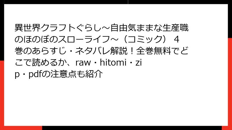 人気の異世界漫画である「異世界クラフトぐらし~自由気ままな生産職のほのぼのスローライフ~(コミック)」を、raw、hitomi、zip、pdf、漫画バンクなどの海賊版サイトで無料で読もうと考える人もいるかもしれません。しかし、これらのサイトを利用することは、さまざまな深刻なリスクを伴います。この記事では、海賊版サイトの利用がもたらす法的、セキュリティ、プライバシー、品質、倫理的・経済的な側面から詳しく解説します。公式ルートで楽しむことを強くおすすめします。