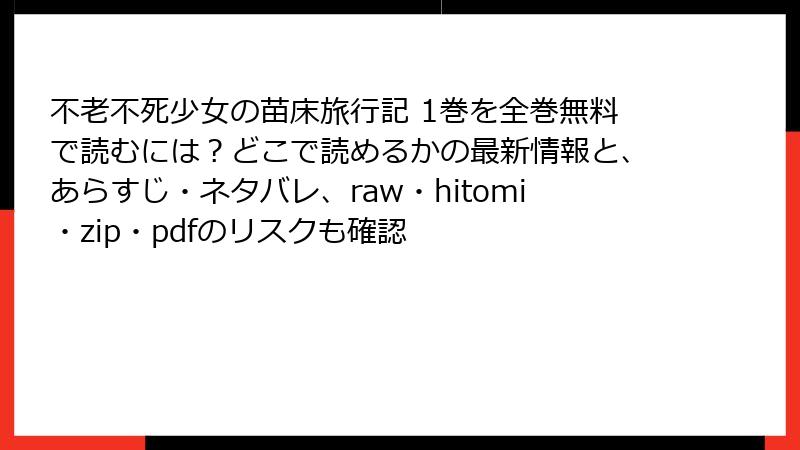 漫画『不老不死少女の苗床旅行記 1巻』をraw、hitomi、zip、pdf、漫画バンクなどの海賊版サイトで読むのは、手軽に思えるかもしれませんが、さまざまな深刻なリスクを伴います。これらのサイトは著作権を侵害した違法コンテンツを提供しており、利用者は知らず知らずのうちにトラブルに巻き込まれる可能性があります。以下では、法的、セキュリティ、倫理的、品質面のリスクを詳しく解説します。海賊版の利用は避け、正規のプラットフォームで楽しむことを強くおすすめします。
