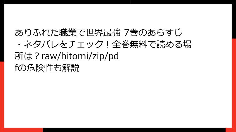 人気の異世界ファンタジー漫画「ありふれた職業で世界最強」の7巻を、raw、hitomi、zip、pdf、漫画バンクなどの海賊版サイトで読むのは一見便利に思えるかもしれません。しかし、これらのサイトを利用することは深刻なリスクを伴います。この記事では、法的、セキュリティ、倫理的な側面から詳しく解説し、なぜ避けるべきかを読み応えのある形でまとめます。合法的な方法で楽しむことを強くおすすめします。
