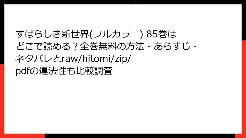 人気のエロティックサスペンス漫画『すばらしき新世界(フルカラー)』の85巻を、海賊版サイトで無料で読もうと考える人もいるかもしれません。しかし、そんな行為には深刻なリスクが伴います。この記事では、法的問題からセキュリティの脅威まで、詳しく解説します。海賊版サイトの利用は作者や出版社の権利を侵害するだけでなく、自分自身を危険にさらす可能性が高いのです。