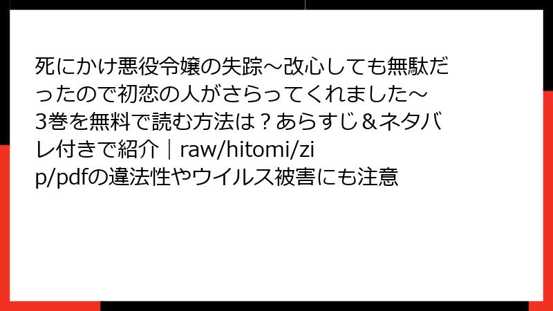 死にかけ悪役令嬢の失踪~改心しても無駄だったので初恋の人がさらってくれました~ 3巻を無料で読む方法は?あらすじ&ネタバレ付きで紹介|raw/hitomi/zip/pdfの違法性やウイルス被害にも注意