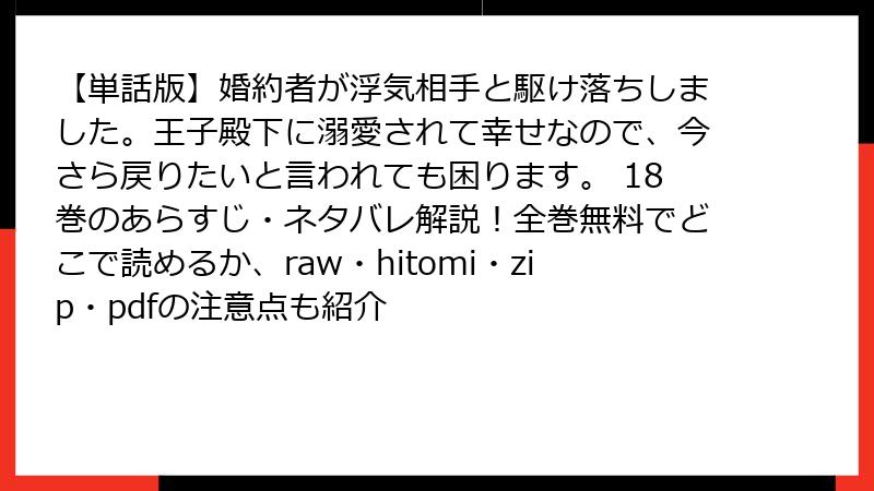 【単話版】婚約者が浮気相手と駆け落ちしました。王子殿下に溺愛されて幸せなので、今さら戻りたいと言われても困ります。 18巻のあらすじ・ネタバレ解説!全巻無料でどこで読めるか、raw・hitomi・zip・pdfの注意点も紹介