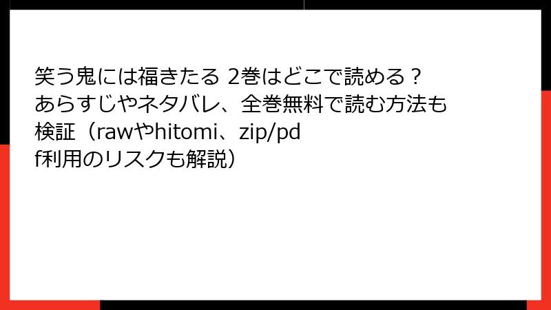 これらのリスクを考慮すると、海賊版サイトで「笑う鬼には福きたる」2巻を読むのは、法的・セキュリティ・倫理的な観点から推奨できません。代わりに、公式チャネルを利用することで、安全で高品質な体験が得られ、業界を支えることができます。海賊版は一時的な便利さを提供するかもしれませんが、長期的な損失が大きいことを理解し、賢明な選択を心がけましょう。