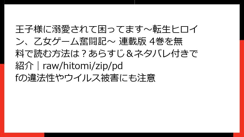 - 王子様に溺愛されて困ってます~転生ヒロイン、乙女ゲーム奮闘記~ 連載版 4巻 をraw/hitomi/zip/pdf/漫画バンクなどの海賊版サイトで読むリスク