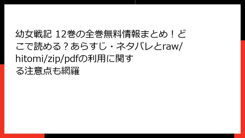 人気のミリタリーファンタジー漫画『幼女戦記』の12巻を、raw、hitomi、zip、pdf、漫画バンクなどの海賊版サイトで読むのは一見手軽ですが、深刻なリスクが伴います。この記事では、法的・セキュリティ・倫理的側面から詳しく解説します。海賊版利用は作者や業界を害するだけでなく、自分自身に大きな被害を招く可能性が高いため、絶対に避けましょう。