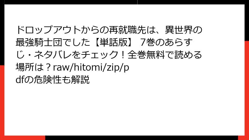 などの箇条書きのHTMLタグや、tableタグも使用してOK。ただし、リンクやURLは、絶対に、挿入しない。ドロップアウトからの再就職先は、異世界の最強騎士団でした【単話版】 7巻 この漫画・コミックの、あらすじを詳しく。単一の