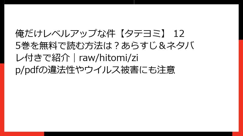 「俺だけレベルアップな件【タテヨミ】」は、人気異世界ファンタジー漫画で、第125巻では主人公の新たな挑戦が描かれています。この記事では、電子書籍版がどのプラットフォームで利用可能かを詳しく解説します。指定されたサービス(コミックシーモア、ブックライブ、まんが王国、ebookjapan、Renta!、めちゃコミック、ピッコマ、LINEマンガ)を中心に、配信状況、価格、無料試し読みの有無などをまとめました。タテヨミ形式の125巻に焦点を当て、読者の選択をサポートします。情報は最新の調査に基づいていますが、キャンペーンは変動する可能性があるのでご注意ください。