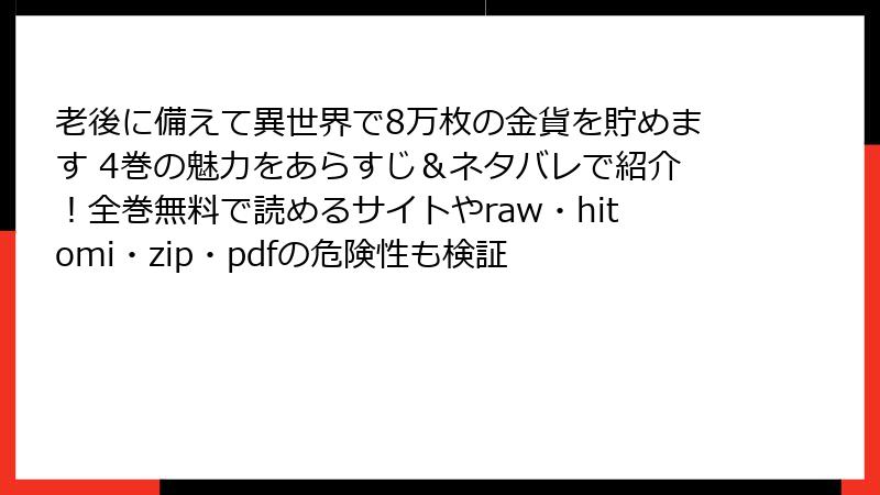 老後に備えて異世界で8万枚の金貨を貯めます 4巻の魅力をあらすじ&ネタバレで紹介!全巻無料で読めるサイトやraw・hitomi・zip・pdfの危険性も検証