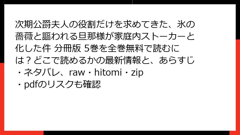 人気のラブコメマンガ「次期公爵夫人の役割だけを求めてきた、氷の薔薇と謳われる旦那様が家庭内ストーカーと化した件 分冊版 5巻」を無料で読みたいと思う人は少なくないでしょう。しかし、raw、hitomi、zip、pdf、漫画バンクなどの海賊版サイトを利用するのは、さまざまなリスクを伴います。この記事では、それらの危険性を詳しく解説し、なぜ避けるべきかを考察します。合法的な方法で楽しむことをおすすめします。