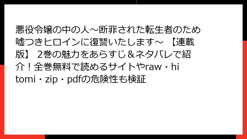 人気マンガ「悪役令嬢の中の人~断罪された転生者のため嘘つきヒロインに復讐いたします~」の連載版2巻を、raw、hitomi、zip、pdf、漫画バンクなどの海賊版サイトで読むのは一見手軽ですが、深刻なリスクを伴います。この記事では、法的、セキュリティ、経済的、品質面などの観点から詳しく解説します。海賊版はクリエイターの権利を侵害する行為であり、避けるべきです。以下で具体的な危険性を掘り下げます。