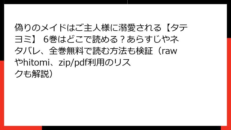 人気のタテヨミ漫画「偽りのメイドはご主人様に溺愛される【タテヨミ】」を楽しみたいと思うのは自然なことですが、海賊版サイト(raw、hitomi、zip、pdf、漫画バンクなど)を利用するのは避けた方が賢明です。これらのサイトは違法アップロードされたコンテンツを提供しており、利用するだけでさまざまなリスクを伴います。この記事では、そんなリスクを法的、セキュリティ、経済的、倫理的な観点から詳しく解説します。海賊版の利用がもたらす問題を理解し、正規の方法で作品を楽しむことをおすすめします。