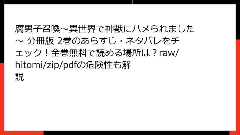 人気BLマンガ「腐男子召喚~異世界で神獣にハメられました~」の分冊版2巻を、raw、hitomi、zip、pdf、漫画バンクなどの海賊版サイトで読むのは便利に思えるかもしれません。しかし、これらのサイトを利用することは深刻なリスクを伴います。この記事では、法的、セキュリティ、経済的、倫理的、品質面のリスクを詳しく解説します。海賊版の利用は避け、正規ルートで楽しむことをおすすめします。
