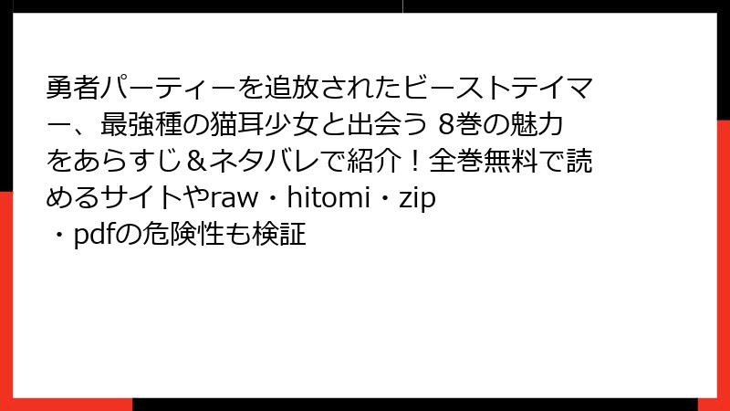 人気のファンタジー漫画「勇者パーティーを追放されたビーストテイマー、最強種の猫耳少女と出会う」を、raw、hitomi、zip、pdf、漫画バンクなどの海賊版サイトで読むのは一見便利に見えますが、深刻なリスクが伴います。この記事では、そのリスクを法的、セキュリティ、プライバシー、経済・倫理的観点から詳しく解説します。海賊版利用はクリエイターの権利を侵害するだけでなく、自分自身にも害を及ぼす可能性が高いのです。