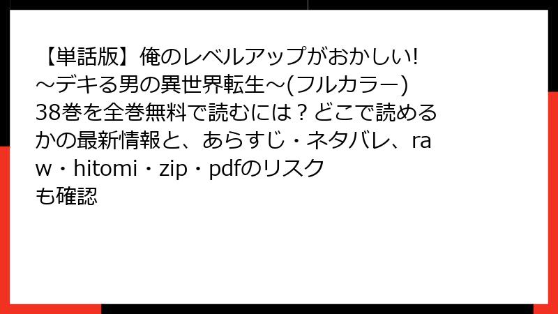 この記事では、指定された漫画「【単話版】俺のレベルアップがおかしい! ~デキる男の異世界転生~(フルカラー) 38巻」を、raw、hitomi、zip、pdf、漫画バンクなどの海賊版サイトで読むことの潜在的なリスクについて詳しく解説します。海賊版サイトの利用は一見便利に見えますが、さまざまな危険が伴います。法的、セキュリティ、倫理的な観点から、なぜ避けるべきかをブログ形式でまとめました。合法的な手段で楽しむことをおすすめします。