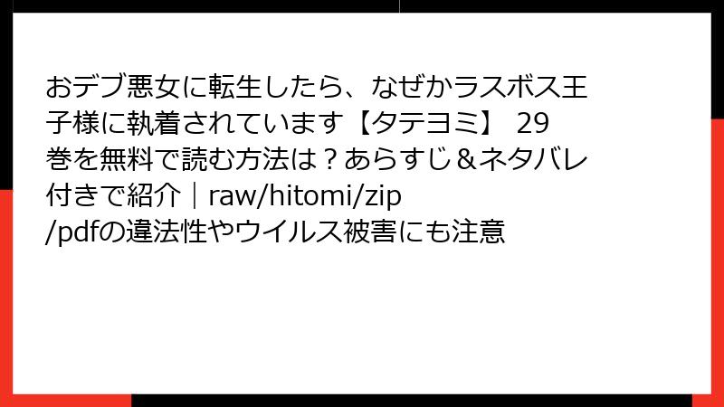 人気のタテヨミコミック「おデブ悪女に転生したら、なぜかラスボス王子様に執着されています」を、raw、hitomi、zip、pdf、漫画バンクなどの海賊版サイトで読むのは一見便利に見えますが、深刻なリスクが伴います。この記事では、そんな海賊版利用の危険性を詳しく解説します。法的問題からセキュリティの脅威、さらには倫理的な側面まで、幅広く掘り下げてみましょう。安全に楽しむための意識を高めるきっかけになれば幸いです。