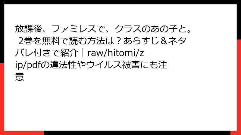 人気漫画「放課後、ファミレスで、クラスのあの子と。」の2巻を、raw、hitomi、zip、pdf、漫画バンクなどの海賊版サイトで読もうとする人がいます。しかし、これらのサイトを利用することは、さまざまな深刻なリスクを伴います。この記事では、法的側面からセキュリティ、プライバシー、倫理的な問題までを詳しく解説します。海賊版サイトの利用は一時的な無料読みに思えても、長期的に見て大きな損失を生む可能性が高いです。読み応えを出すために、各リスクを深掘りし、具体例を交えて分析します。
