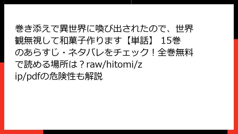 人気の異世界漫画「巻き添えで異世界に喚び出されたので、世界観無視して和菓子作ります」を、raw、hitomi、zip、pdf、漫画バンクなどの海賊版サイトで読むのは一見便利に思えますが、深刻なリスクが伴います。この記事では、そうした違法サイトの利用がもたらす法的、セキュリティ的、倫理的な問題を詳しく解説します。海賊版はクリエイターの権利を侵害するだけでなく、利用者自身に大きな被害を及ぼす可能性があります。以下で具体的に掘り下げていきましょう。