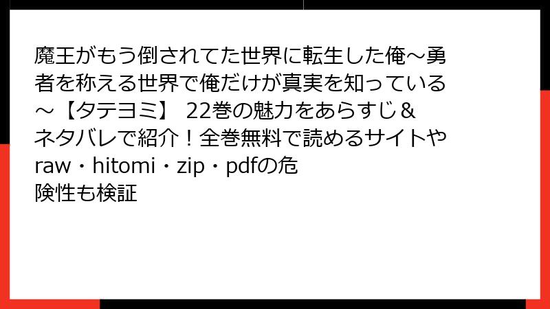 このマンガは、異世界転生の定番を逆手に取ったサスペンス要素満載のストーリー。主人公の浦伊吹が勇者として転生した世界で、すでに魔王が倒されているという設定から始まり、勇者パーティの秘密に迫っていきます。以下では、シリーズ全体のネタバレを中心に、入手可能な情報に基づいて詳しく解説します。特に22巻(第22話)については、詳細な情報が限定的ですが、物語の流れから推測される展開を交えつつまとめます。ネタバレを避けたい方は、ここで閲覧を中止してください。