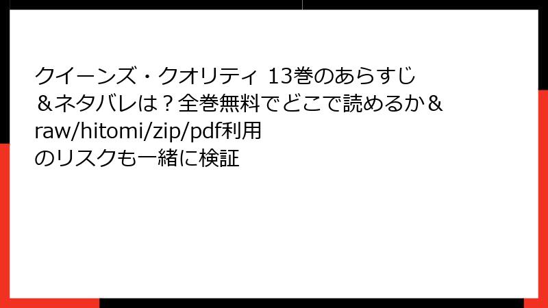 人気漫画「クイーンズ・クオリティ」の13巻を、raw、hitomi、zip、pdf、漫画バンクなどの海賊版サイトで読む行為は、便利に見えて実は多大なリスクを伴います。これらのサイトは、出版社や作者の許可なく作品を違法にアップロードしており、利用者は知らず知らずのうちにトラブルに巻き込まれる可能性があります。この記事では、そんな海賊版サイトの利用に伴う法的、セキュリティ、品質、倫理的リスクを詳しく解説します。海賊版の利用を検討している方は、ぜひこれらの危険性を理解してください。