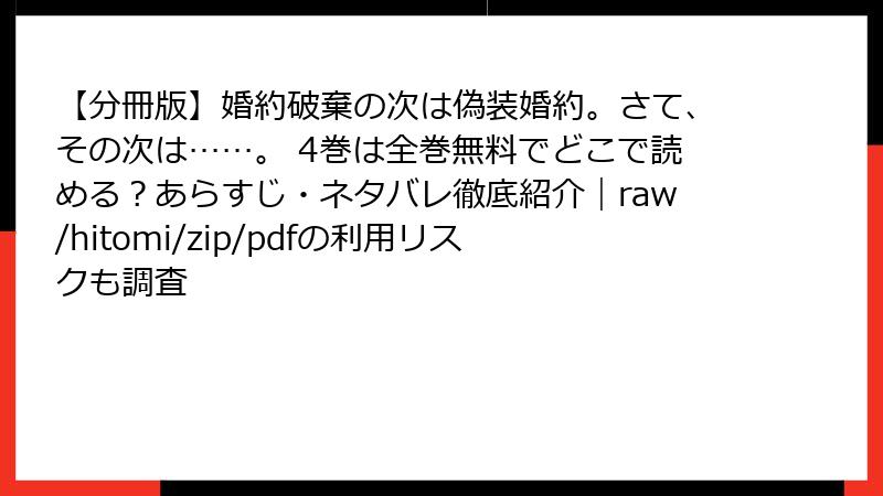 人気のラブファンタジーコミック「婚約破棄の次は偽装婚約。さて、その次は……。」を、海賊版サイトで無料で読もうとする人は少なくありません。しかし、そんな行為には深刻なリスクが伴います。この記事では、raw、hitomi、zip、pdf、漫画バンクなどの違法サイトを利用する危険性を、法的・セキュリティ・倫理的な観点から詳しく解説します。安易な利用は避け、合法的な手段を選ぶことを強くおすすめします。