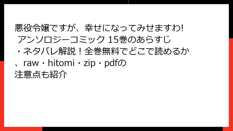 第15巻は、悪役令嬢をテーマにしたアンソロジーとして、5つの独立したストーリーを収録。各話がハッピーエンドで終わるのが魅力ですが、ネタバレとして、主人公たちの苦難と勝利の過程を詳しく解説します。共通のテーマは「逆転」と「幸せの掴み取り」で、ファンタジー要素が強く絡みます。
