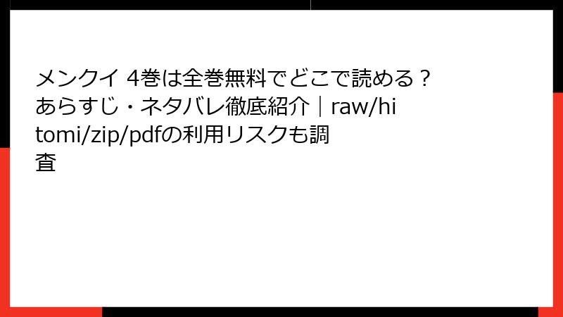 配信状況は変動する可能性があるため、最新情報を各サービスで確認してください。また、海賊版サイトの利用は避け、正規ルートで作者を支援しましょう。「メンクイ」4巻はこれらのサービスで幅広く読め、ファンにとってアクセスしやすい環境です。魅力的なストーリーを存分に楽しんでください。