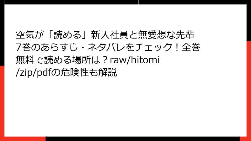 人気のオフィスラブコメ漫画『空気が「読める」新入社員と無愛想な先輩』を、raw、hitomi、zip、pdf、漫画バンクなどの海賊版サイトで読むのは一見便利そうですが、実はさまざまなリスクが伴います。この記事では、そんな海賊版利用の危険性を詳しく解説します。合法的な方法で楽しむことをおすすめしますが、ここではリスクに焦点を当てて深掘りします。