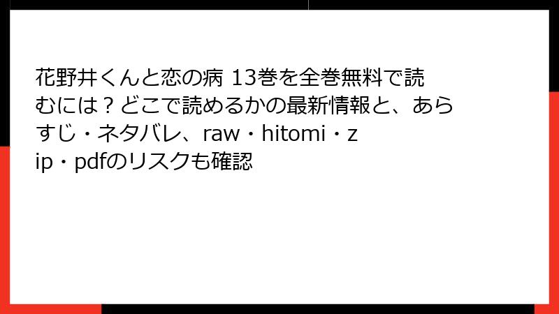 人気少女漫画「花野井くんと恋の病」を、raw、hitomi、zip、pdf、漫画バンクなどの海賊版サイトで読むことは、一見無料で手軽に思えるかもしれません。しかし、これらのサイトを利用することは深刻なリスクを伴います。著作権侵害の観点から法的問題が発生するだけでなく、セキュリティ面での脅威や経済的な影響も無視できません。以下では、これらのリスクを詳しく解説します。海賊版の利用はクリエイターの努力を踏みにじる行為であり、避けるべきです。