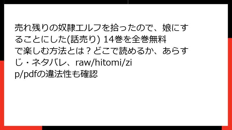 人気のファンタジー漫画「売れ残りの奴隷エルフを拾ったので、娘にすることにした(話売り)」を、raw、hitomi、zip、pdf、漫画バンクなどの海賊版サイトで読むのは魅力的かもしれませんが、多くの深刻なリスクが伴います。この記事では、そうした海賊版利用の危険性を詳しく解説します。合法的な方法を選ぶことを強くおすすめします。