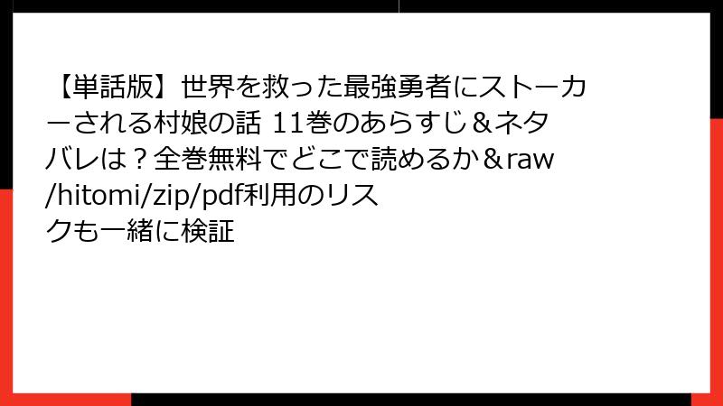 人気ファンタジーコミック『【単話版】世界を救った最強勇者にストーカーされる村娘の話』を、raw、hitomi、zip、pdf、漫画バンクなどの海賊版サイトで読むのは一見便利に思えますが、実は多大なリスクを伴います。この記事では、そんな海賊版利用の危険性をブログ形式で詳しく掘り下げます。法的問題からセキュリティの脅威まで、読み応えのある内容でお届け。海賊版はクリエイターの権利を侵害し、自分自身にも害を及ぼす可能性が高いことを理解しましょう。合法的な手段で楽しむことをおすすめします。