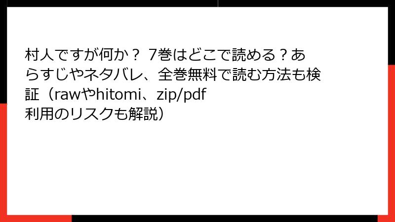 raw、hitomi、zip、pdf、漫画バンクなどの海賊版サイトで「村人ですが何か?」を読むのは、法的・セキュリティ的なリスクが大きすぎます。一時の無料に釣られて、後悔する事態を避けるため、正規ルートを選びましょう。安全で倫理的な選択が、長期的に見て作品を楽しむ鍵です。