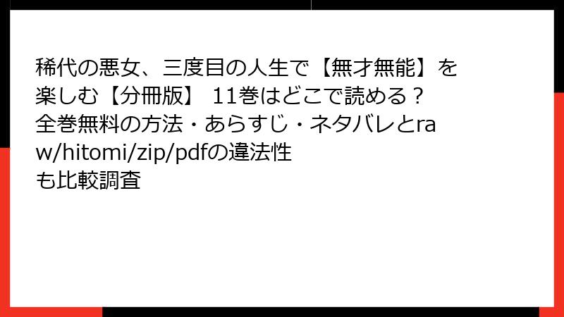 人気の異世界転生漫画「稀代の悪女、三度目の人生で【無才無能】を楽しむ」を、raw、hitomi、zip、pdf、漫画バンクなどの海賊版サイトで読むのは一見便利に思えますが、実は深刻なリスクが伴います。この記事では、そんな海賊版利用の危険性を多角的に解説。法的問題からセキュリティの脅威、倫理的側面までを深掘りし、なぜ正規ルートをおすすめするのかを考察します。海賊版はクリエイターや業界全体に悪影響を及ぼすので、ぜひ参考に。