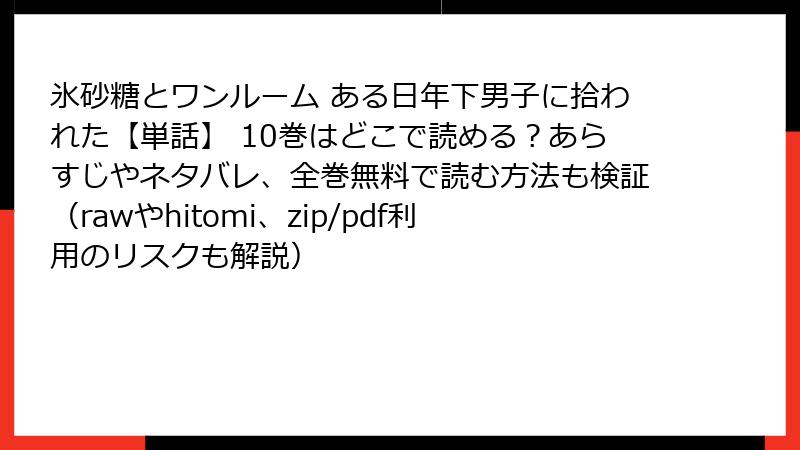 人気マンガ「氷砂糖とワンルーム ある日年下男子に拾われた」の単話版10巻は、心温まるストーリーで多くのファンを魅了しています。しかし、海賊版サイト(raw、hitomi、zip、pdf、漫画バンクなど)でこの作品を読む行為は、さまざまなリスクを伴います。この記事では、そうした海賊版利用の危険性を詳しく解説します。法的問題からセキュリティ脅威、倫理的側面までを深掘りし、正規ルートでの読書をおすすめする理由を明らかにします。海賊版は一見便利ですが、長期的に見て損失が大きいことを理解しましょう。