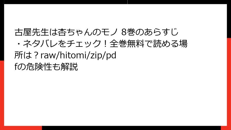 人気漫画「古屋先生は杏ちゃんのモノ」を楽しみたい気持ちはわかりますが、海賊版サイト(raw、hitomi、zip、pdf、漫画バンクなど)を利用するのは避けた方が賢明です。これらのサイトは違法アップロードされたコンテンツを提供しており、利用者はさまざまなリスクを負うことになります。この記事では、そんな海賊版サイトの利用に伴うリスクを詳しく解説。法的問題からセキュリティ面まで、読み応えのある内容でお届けします。海賊版ではなく、正規の手段で楽しむことをおすすめします。